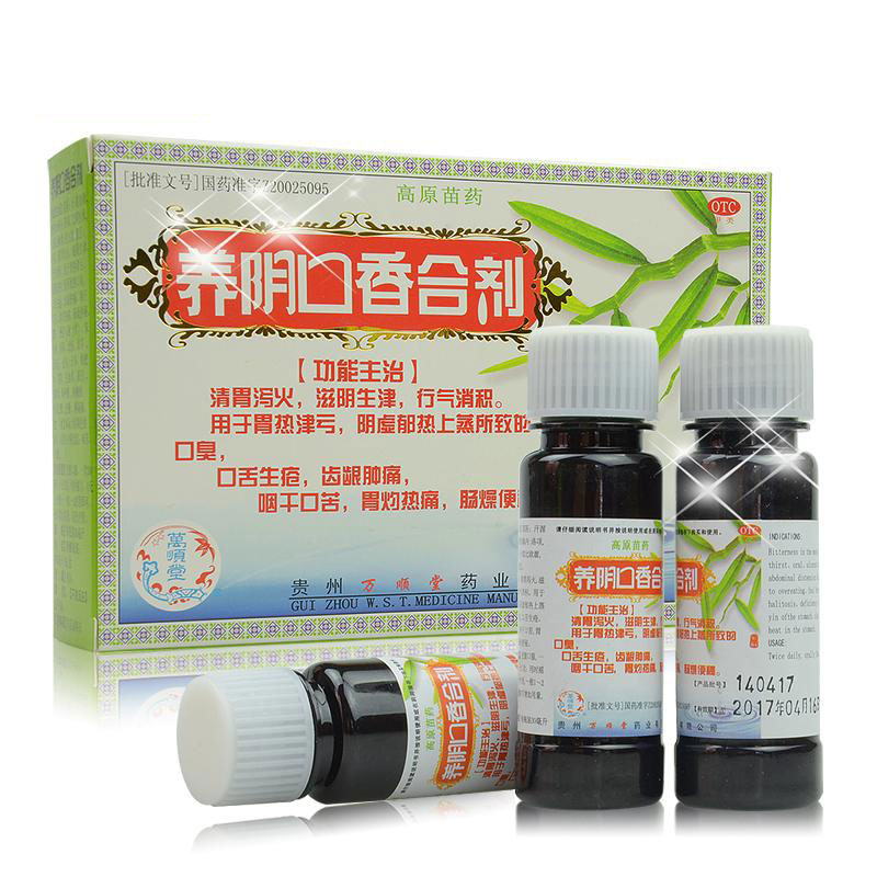 养阴口香合剂,苗医: 汗渥曲勒,旭嘎怡滇内,洛项,来罗拉米,干郎比欧溜,劳力宫,蒙丢。中医:清胃泻火,滋阴生津,行气消积。用于胃热津亏,阴虚郁热上蒸所致的口臭,口舌生疮,齿龈肿痛,咽干口苦,胃灼热痛,肠燥便秘。